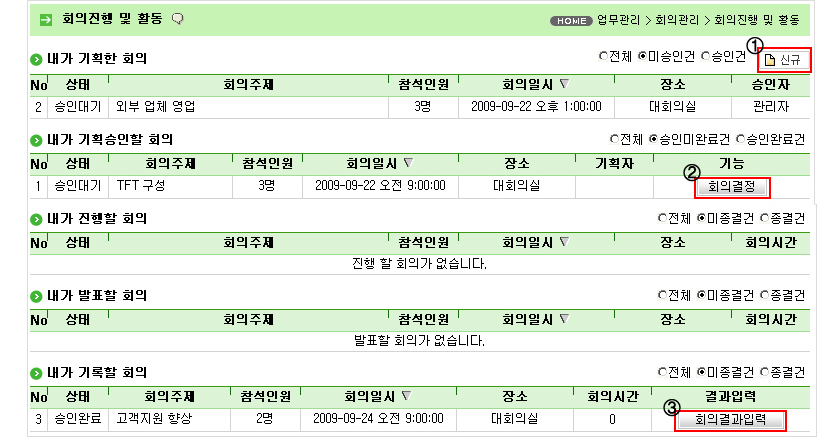 - 내가 기획승인할 회의 - 내가 기획한 회의 - 내가 진행할 회의 - 내가 발표할 회의 - 내가 기록할 회의 - 내가 참석할 회의 |