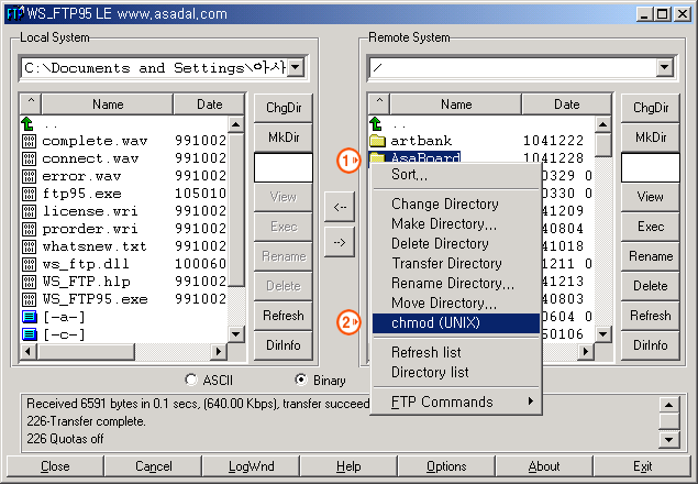 • 왼쪽에서 올리고자 하는 파일을 선택하고, 오른쪽에서 파일을 올릴 디렉터리를 선택한 후 를 누릅니다. 이 때, cgi 파일은 ASKII 형식으로, 그림 파일은 Binary 형식으로 보냅니다. HTML 파일은 어떤 형식이라도 상관 없습니다.
