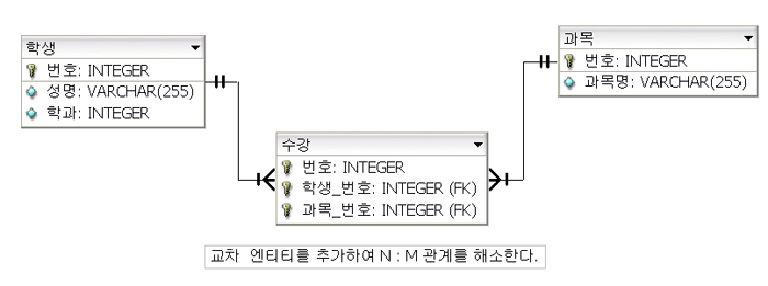 이처럼 N:M 관계는 교차 Entity를 도출하여 해소한다.